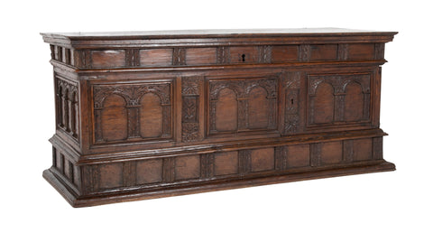 Superb 17th century Spanish Baroque wedding cassone, the walnut surface hand carved with architectural designs, arches, geometric and floral motifs throughout, including on the inside of the lid. One front panel opens to reveal three drawers. Wonderful warm honey patina, great for storage and a real conversation piece.    Circa 1650.