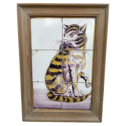 Wonderful Dutch 18th century tile painting of a cat with holding a mouse in it's mouth. Depicted right after the catch, with paw lifted showing exposed claws. The yellow and manganese striped cat looking confident ans self possessed, with the mouse's head in her mouth. An artful portrait of a pet cat whose job it was to keep the house rodent free. Painted in Rotterdam, second half of the 18th century. These cat portraits from this period are thoroughly charming artifacts that bring home how much we have in common with our ancestors. Tiles laid down on masonite in a cerused wood frame. Various cracks and old restorations expected with glazed ceramics this age. Circa 1775.