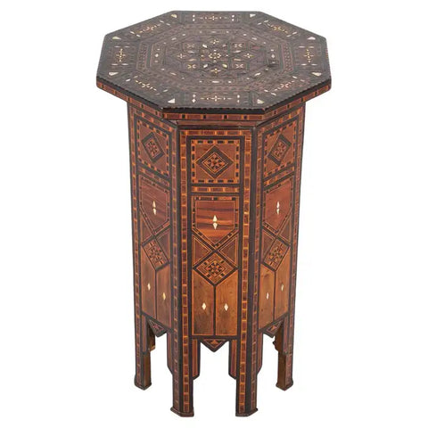 Syrian octagonal side with inlay of mother-of-pearl ebony, rosewood, and various fruit woods. Best quality, with intricate geometric inlay over the surface and sides. With a beautiful silhouette, this will make a singular drinks table. Stamped "Damas, Syrie" under the top, showing it was made in the once cosmopolitan capital of Syria, Damascus. Circa 1900.