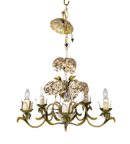 Wonderful 1950's tole five arm chandelier with white painted Hydrangeas and canopy.