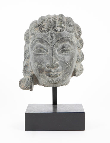 Carved greenstone head of Parvati on modern stand.  India.  10 - 12th Century.