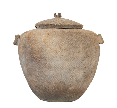 Chinese "Warring States Period" covered pottery jar having gray simulated cloth surface with pair of loop handles and recumbent bird on top. Circa 481/403 BCE - 221 BCE.