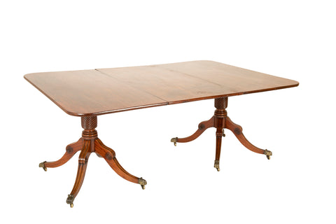A English regency dining table with great patina. Pedestal rise off of four legs with castors and brass capped feet. Circa 1820.