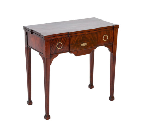 19th Century English Mahogany Games Table with folding top and side drawer having two faux ring drawer pulls.