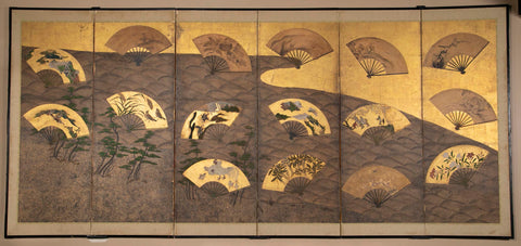 A 6 panel Japanese screen depicting fans on gold leaf ground. Late 17th - Early 18th Century.