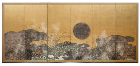 A 19th Century Japanese Rimpa School Screen depicting Moon Over Plains of Musashino. NAGA Antiques label on reverse.