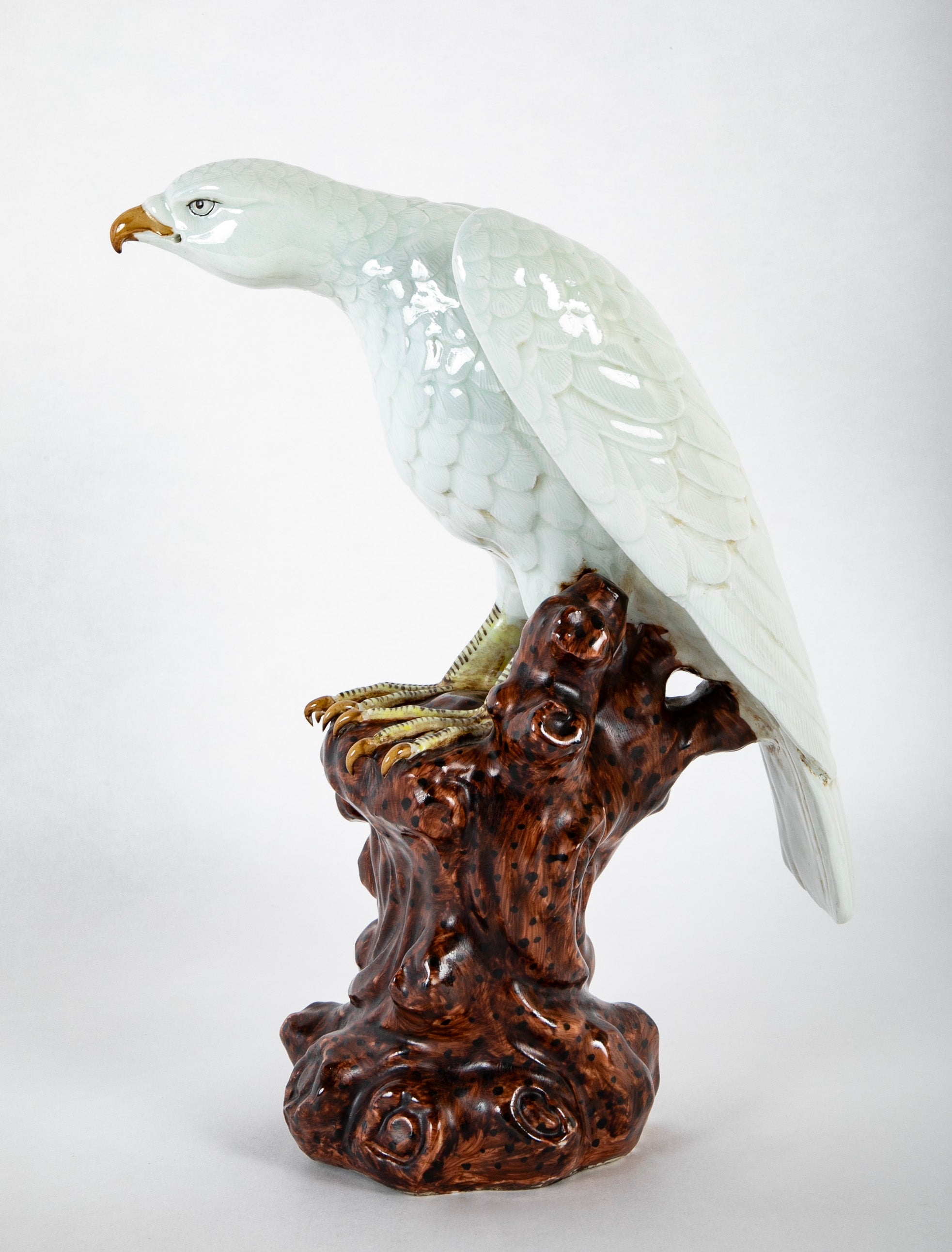 A Japanese White Glazed Porcelain Hawk Perched on a Tree Stump