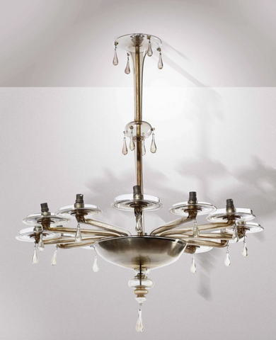 A ten arm Murano glass chandelier with slightly smoked glass elements. Circa 1970.