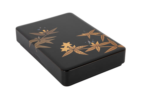 A rectangular Japanese Wajima lacquered covered box with gilt leaf decoration. 20th century.