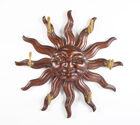 Carved Oak Sunburst with Center Face Wall Mounted Coat Rack