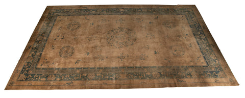 Chinese carpet with floral and eyed border around field of 5 medallions.