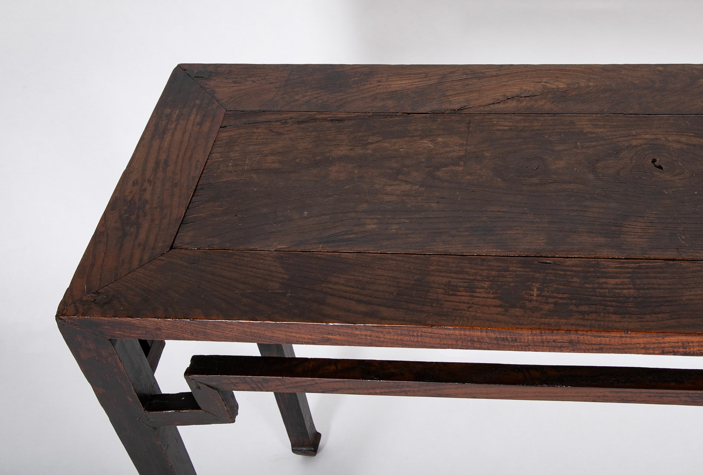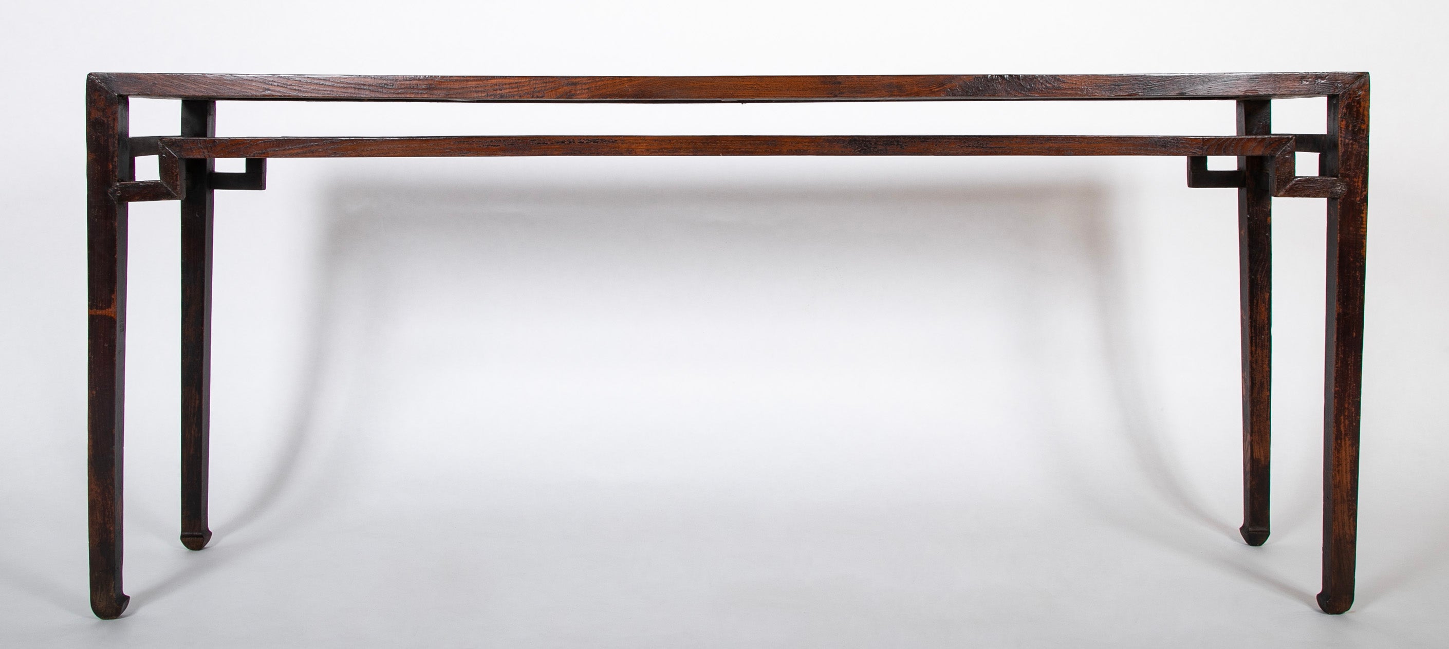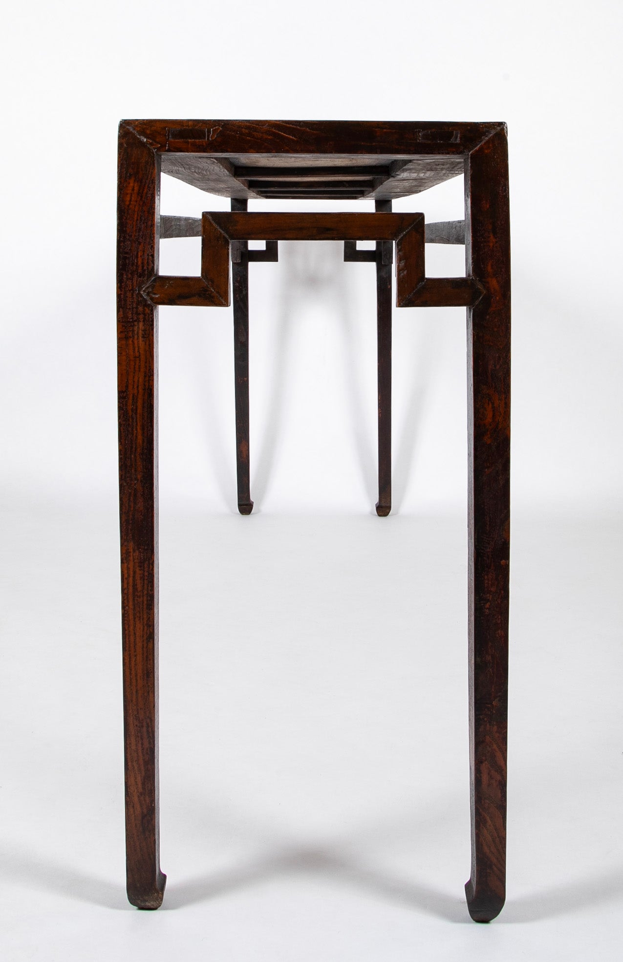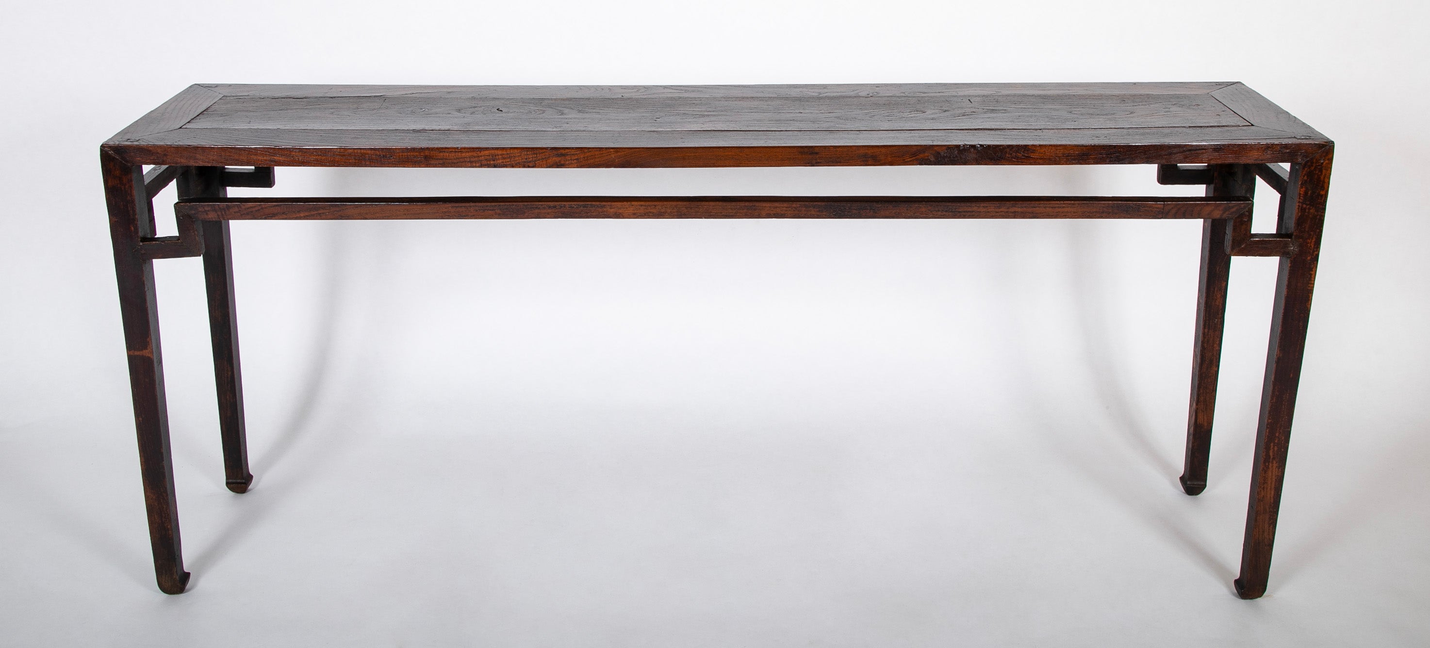 18th century Chinese elm console table with square form humpback stretchers.  Shanxi Province.