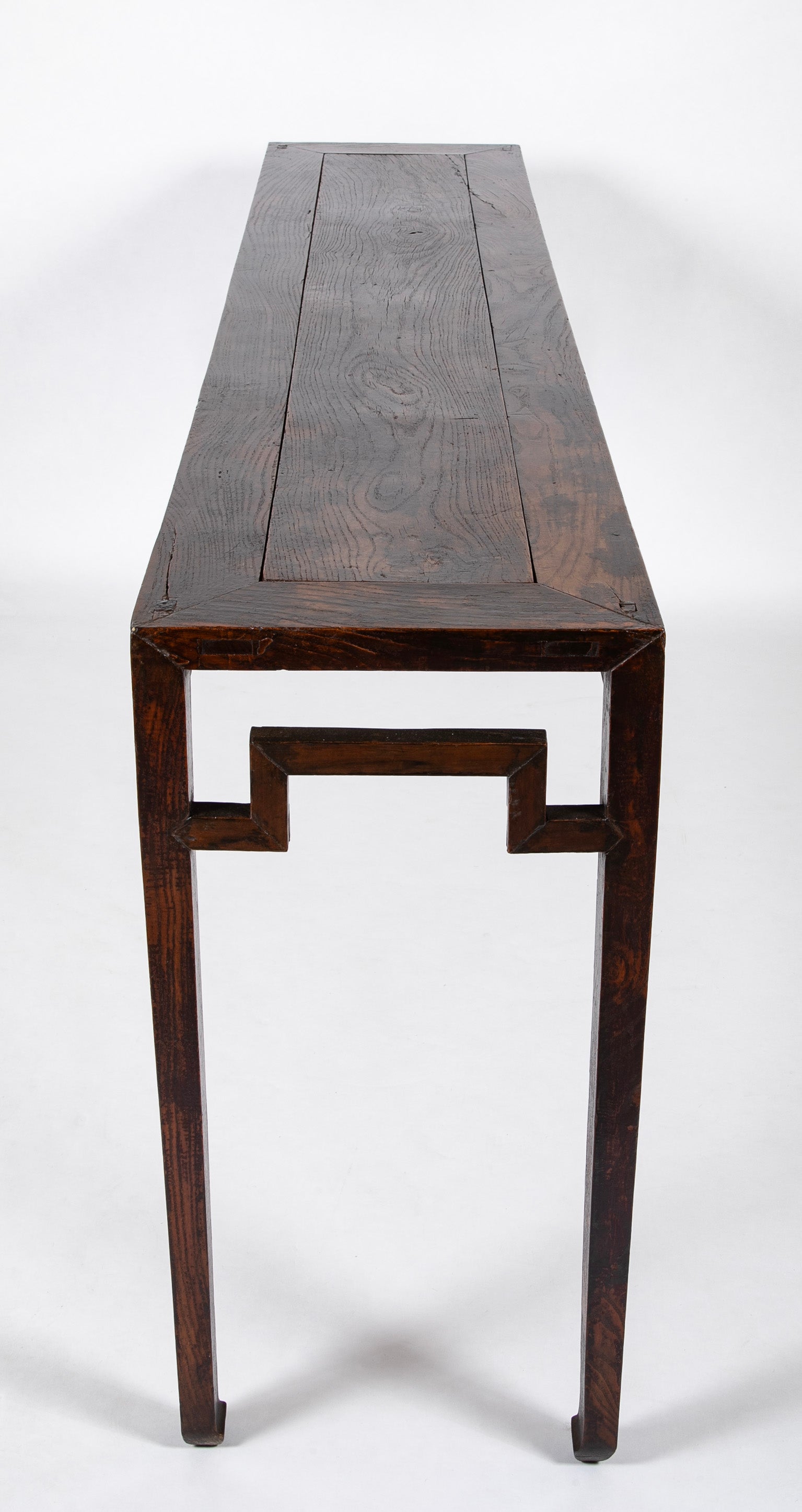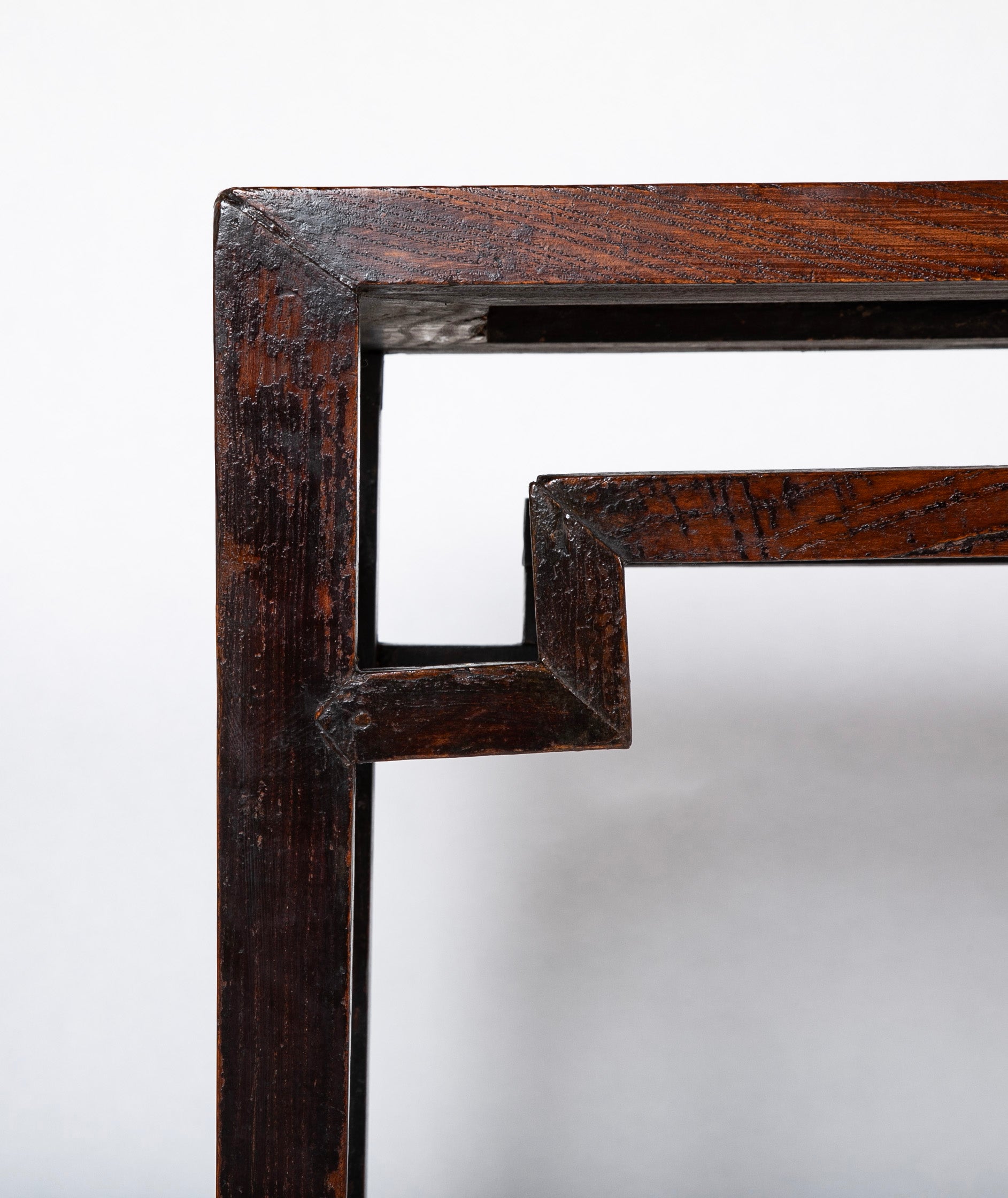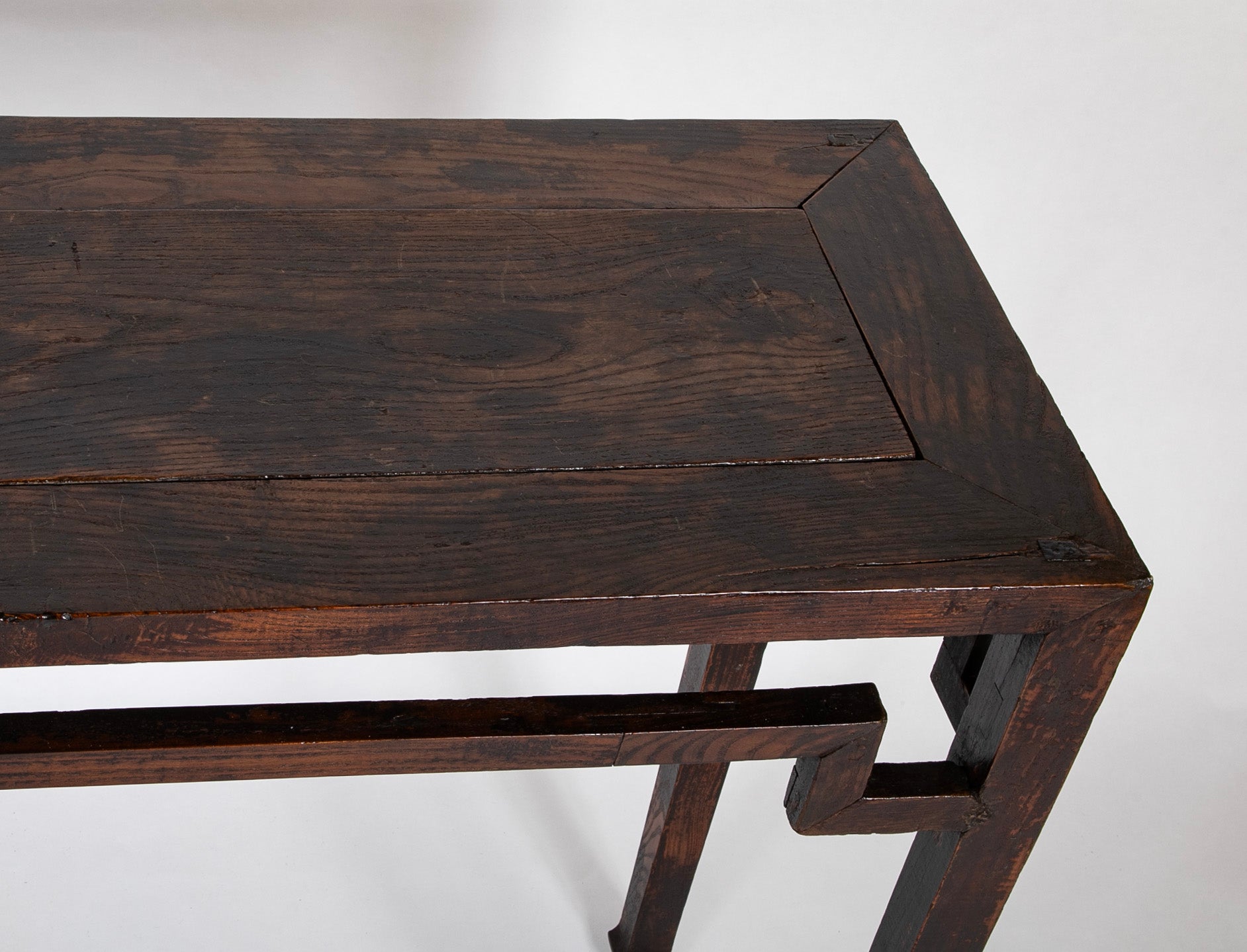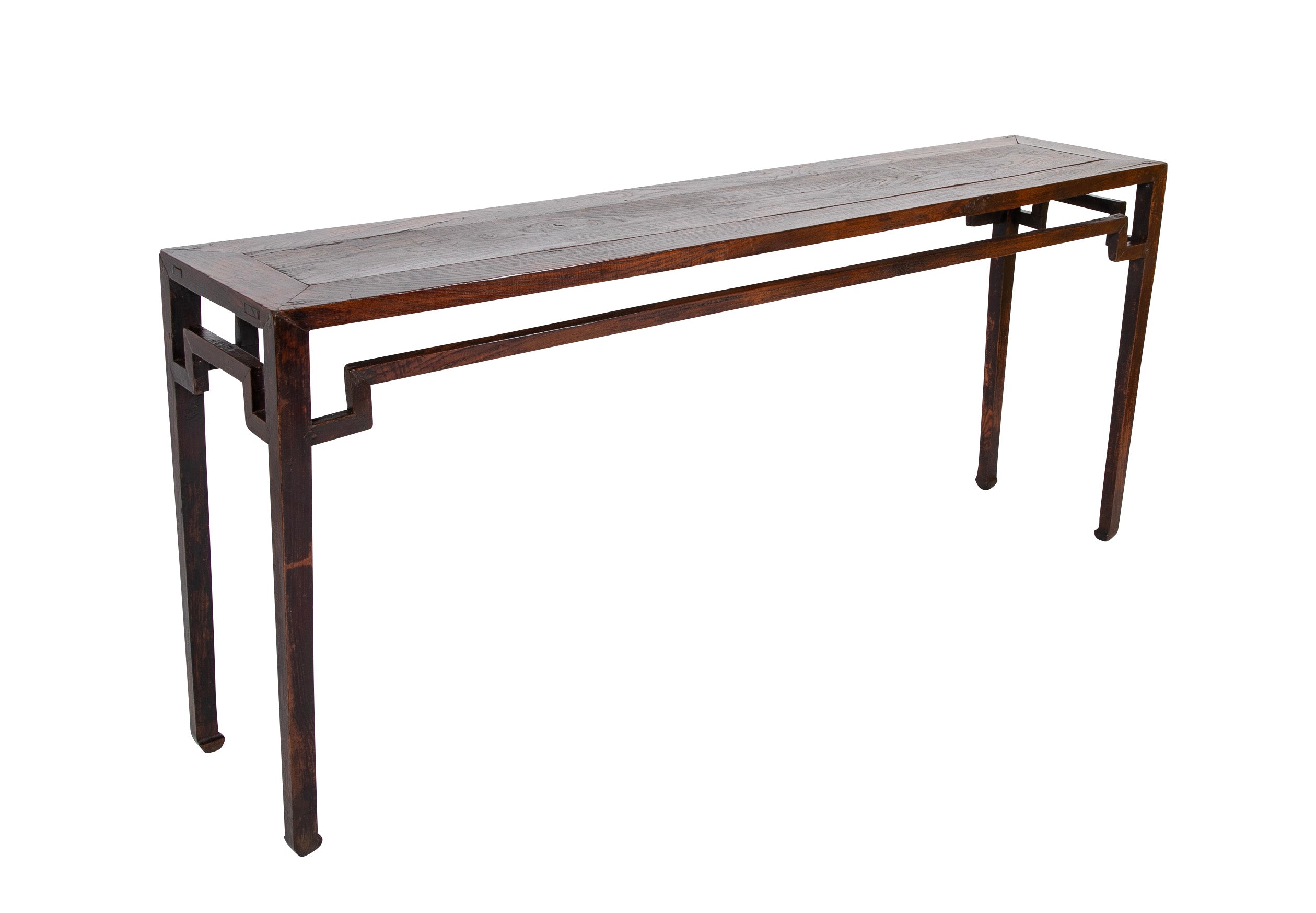 18th century Chinese elm console table with square form humpback stretchers.  Shanxi Province.