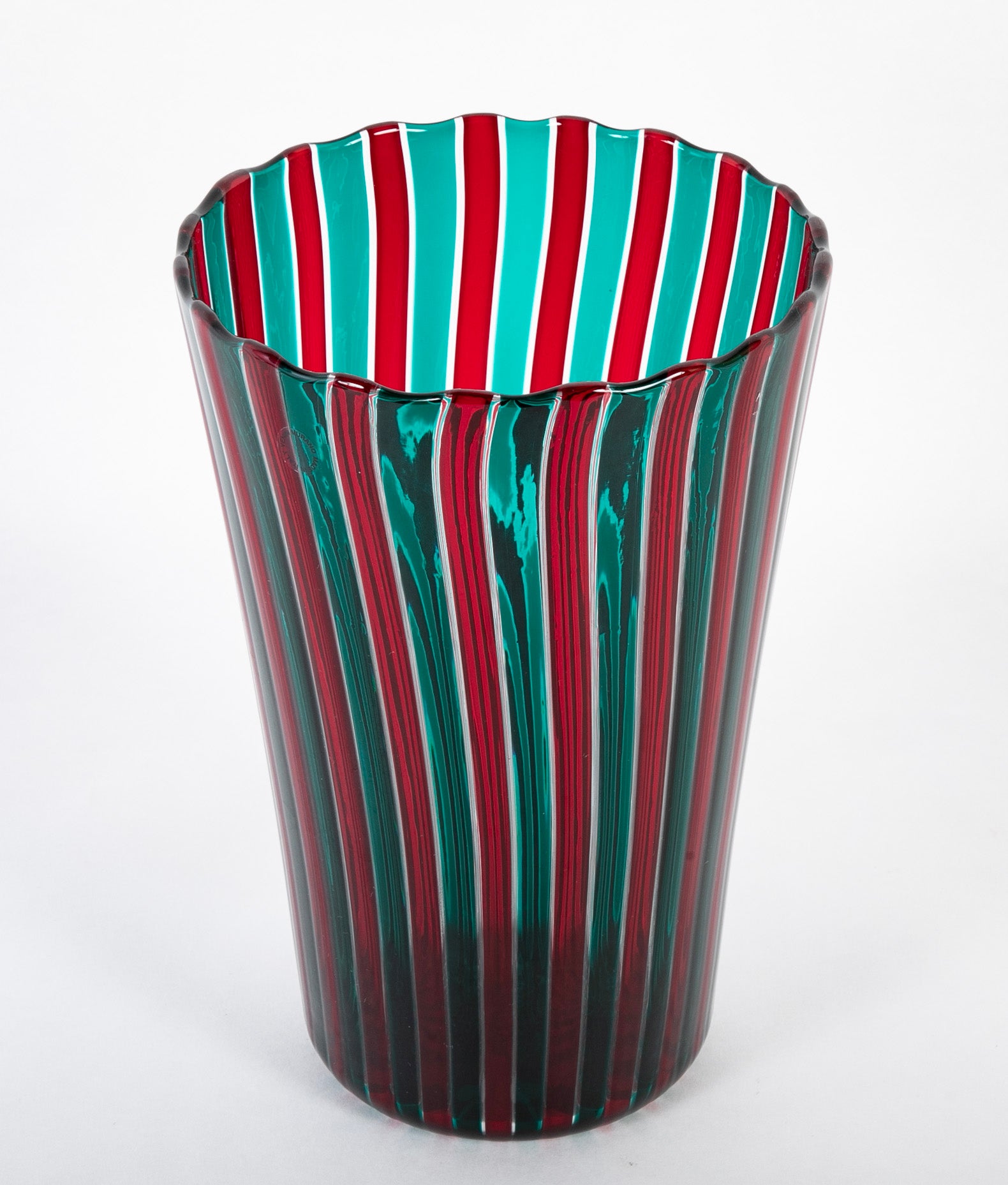 Gio Ponti ( 1891 - 1979 ) for Venini red and green "a canne" glass vase. Murano, Italy. Marked "Venini/2001". 2001 from a 1955 design.