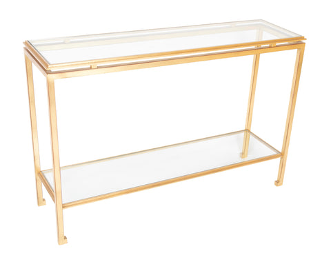 A Guy Lefevre for Maison Jansen gilt iron two tier console table with glass tops.