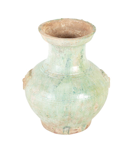 Han Dynasty Pottery Jar with Green Glaze and Molded Masks as Applied Handles