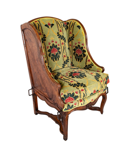 A handsome French Louis XV period grand scale carved walnut armchair later adapted with mounted handwrought iron brackets for sedan use. 18th century.