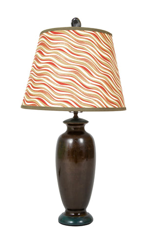 A bronze vase with subtly etched decor on shoulder band as lamp having a custom made lamp shade.
