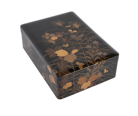 A Japanese black lacquered box depicting stylized wheat and flowers.