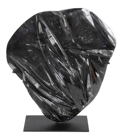 Orthoceras fossil plate with multiple Cephalopods on modern stand. Morocco. Ordovician Period.