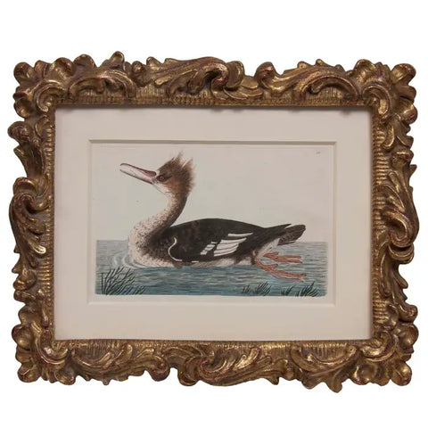A Shaw & Nodden hand colored engraving of a merganser duck in wonderful hand-carved gilt Baroque frame.  England.  Circa 1795.