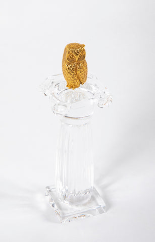 Steuben 18kt gold owl on crystal column designed by James Houston, having it's original fitted red leather case. Engraved "Steuben". Circa 1974.