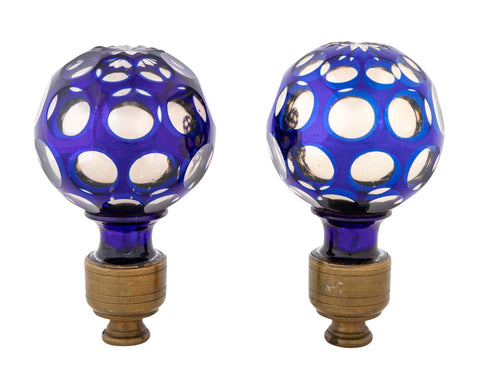 Pair of blown cobalt blue glass & colorless mercury globe newel post finials, each with 4 rows of circles under star at top and lower brass receiver. Massachusetts / New England. Late 19th century.
