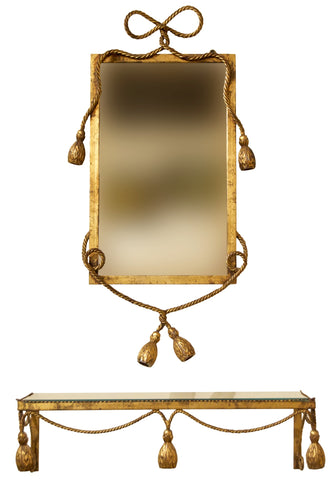 An American Regency style gilt metal mirror and shelf set, perfect sizing for a small entryway. Circa 1920- 1950.