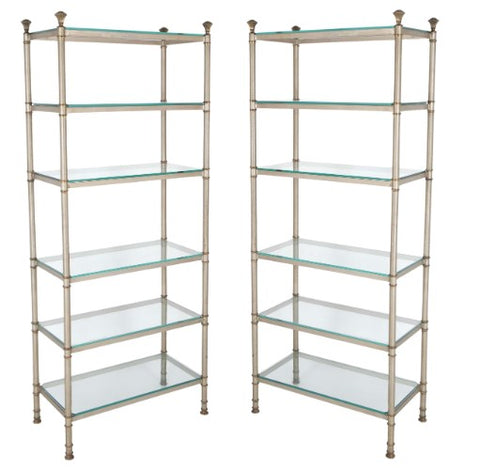 A pair of gilt metal etageres with pineapple finials and glass shelves having a solid and quality construction.