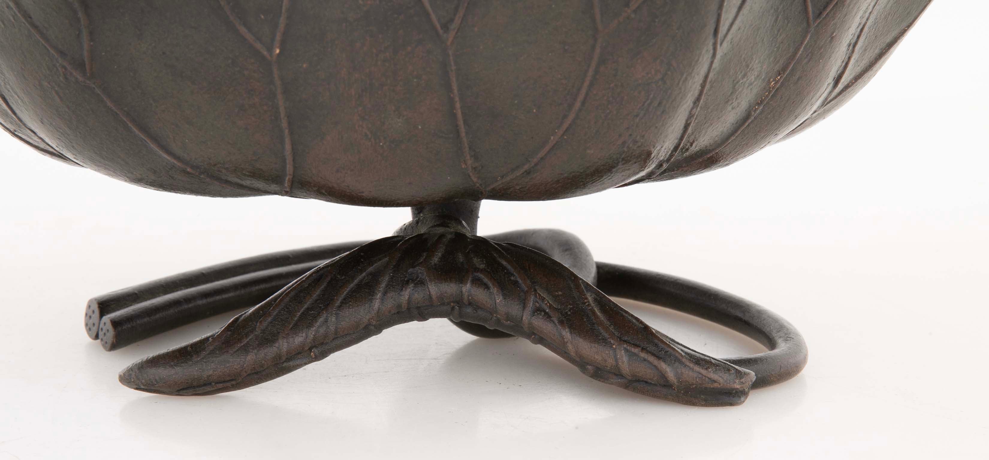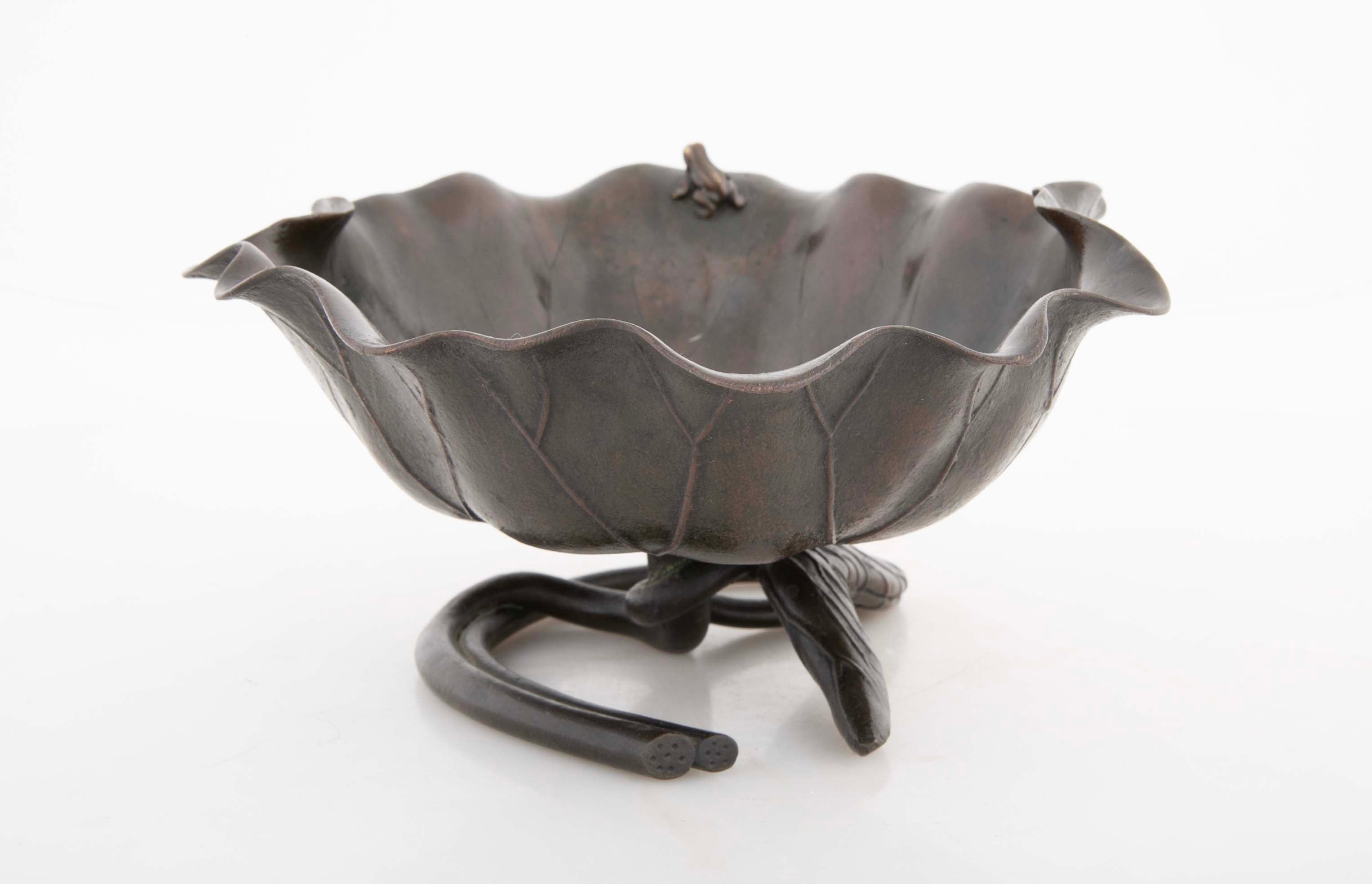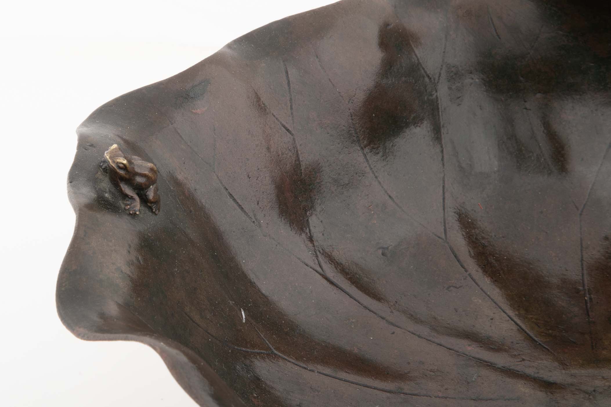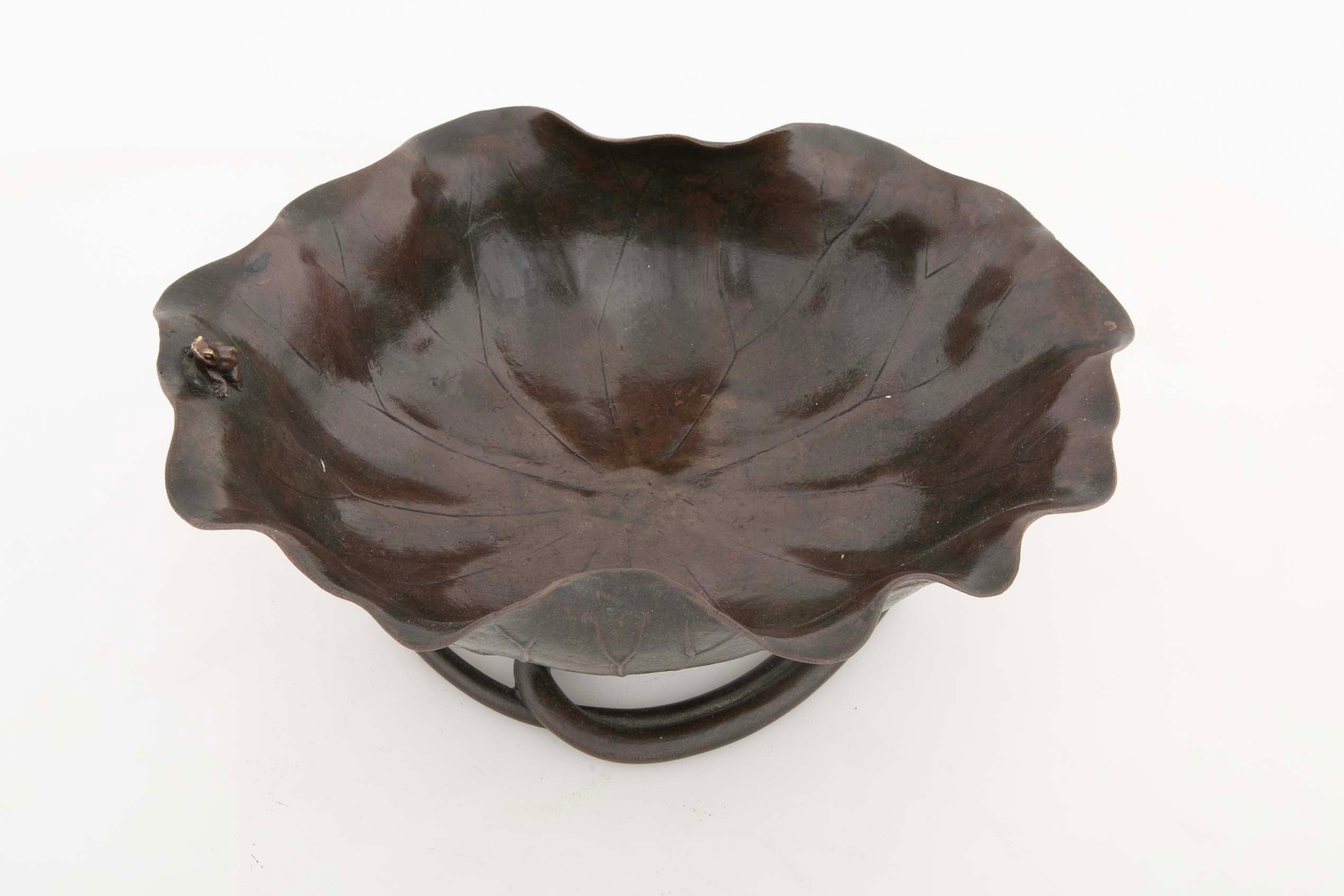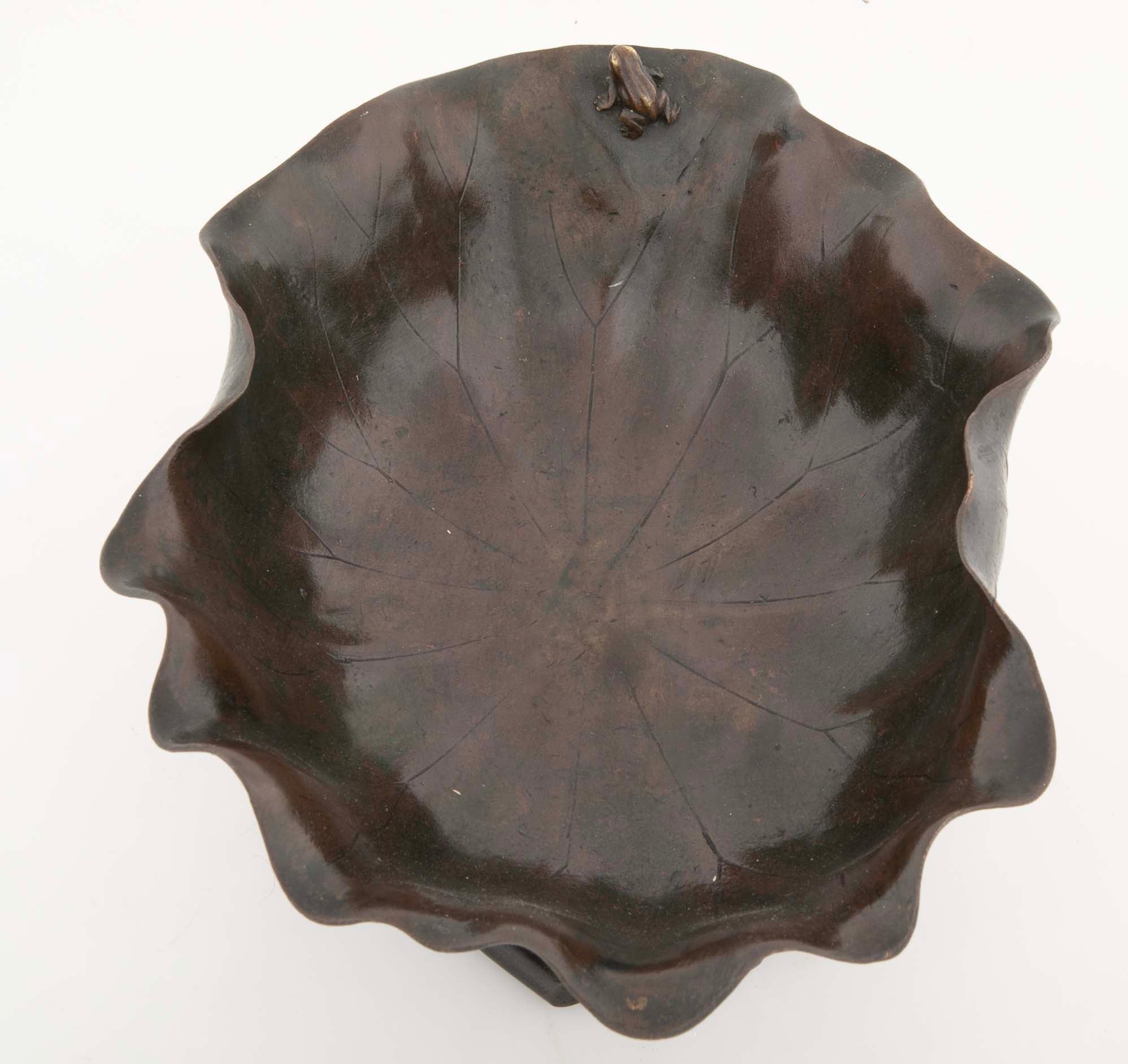 A patinated bronze bowl in the shape of a lotus leaf with small frog.