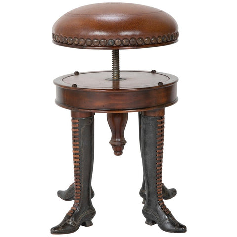 An adjustable, revolving stool having four bronze legs & feet in the shape of boots with leather upholstered brass studded seat.