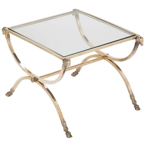 Neoclassical style X-form gilt bronze side table in the with single stretcher. The four corners with rams heads, the legs ending in hoof feet. This table, though modeled on ancient Roman examples, is quintessentially modern. Works well in any interior, antique or modern, or a mixture of both. The perfect side or end table with presence and it's own personality. Marked Italy on bottom of two of the feet.