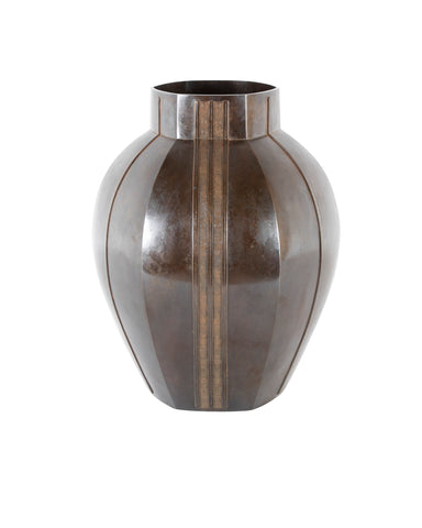 Of ovoid shape with a short neck, each panel of the body decorated with a single vertical band alternating with a double band filled with spirals and lines in relief. Original wooden box, the lid with an inscription reading Seidô ruimon rokugata kabin (bronze six-corned flower vase with chain pattern), the reverse of the lid with inscription reading Teiten shuppin (displayed at Teiten) Tomiyasu saku and sealed Tomi.  Circa 1930's.