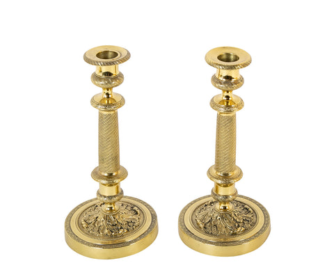 Pair of French Restauration brass candlesticks having round base molded with swirled acanthus leaves & flowers. 2nd quarter of 19th century.