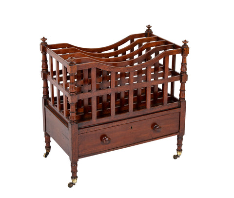 Large mahogany "Federal" Sheraton canterbury with original knobs on drawer, casters and finials - possibly American.   Circa 1810.