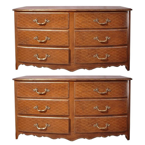 Impressive pair of large-scale French Mid-Century Regence style leather wrapped commodes with bronze mounts. The leather with tooled gilt diamond pattern decoration. Circa 1960's.