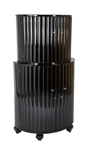 French Art Deco demilune reeded and ebonized cocktail cabinet having two levels, each with two doors and chromed spherical handles. Circa 1930's.