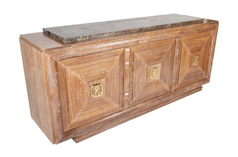 French cerused oak three door architectural sideboard with inset marble top and bronze door handles.   Circa 1940's.  France.