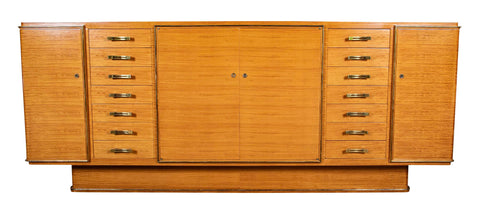 French School of Dominique large 4 door tiger maple sideboard with 14 drawers.  Circa 1940.
