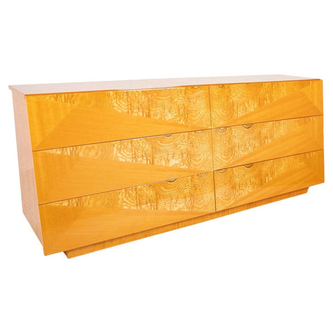An Italian "Giorgio Collection" dresser in burr satinwood with tapered facade having exotic veneer. An exquisite and unique design.