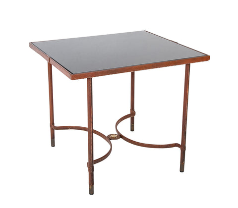 A glass top card table with leather wrapped steel armature and brass sabot. Having a brass star, indicative of Jacques Adnet's designs Circa 1935. Please note the glass is period black glass and has scratches in keeping with it 88 years in play. There is one chip to the underside of the glass.
