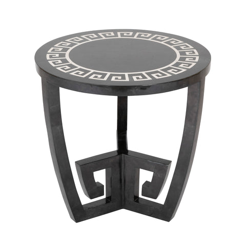Black round table with Greek key design having a tessellated marble top