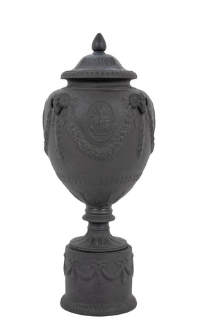20th Century dark gray English ceramic urn in the style of Wedgwood.