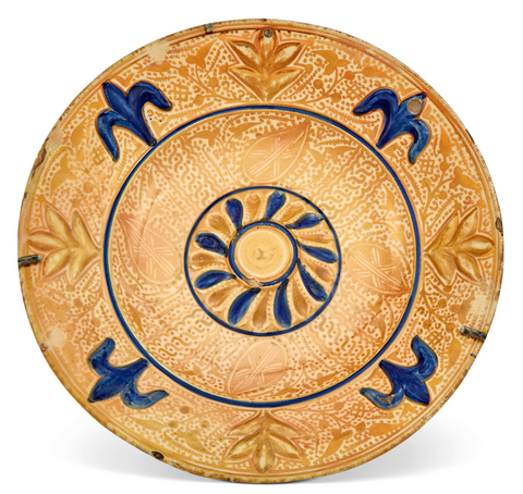 A Hispano Moresque ceramic charger with blue and luster glaze having central gadrooned motif with 4 stylized birds around it. Having antique metal hanging apparatus.