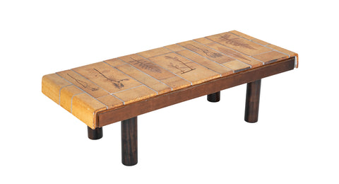 A Roger Capron ( French. 1922 - 2006 ) coffee table in stained wood with ceramic tile top having botanical designs. Circa 1960 - 1970's. France.