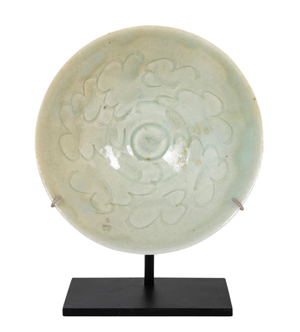 Celadon green Chinese porcelain Qingbai bowl with interior incised cloud design on modern stand.
