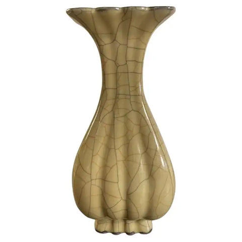 A Chinese crackle glazed ceramic vase of lovely form and proportions. The cream colored glaze crazed with a crackle glaze in cinnamon red and black, the foot and lip rimmed with a silvery gun metal gray. Very elegant form, body of voluptuous melon form ribs culminating in the fluted neck and widely flared lip. Just an exquisite designed and realized piece of ceramic. Circa 1950's