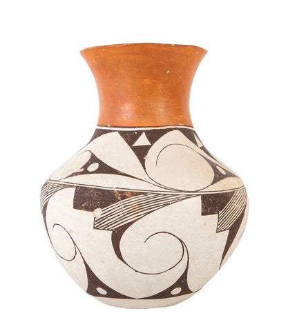 Mid 20th century Acoma vessel with extended flared neck in terracotta color and black & white decorated body.  New Mexico, USA.