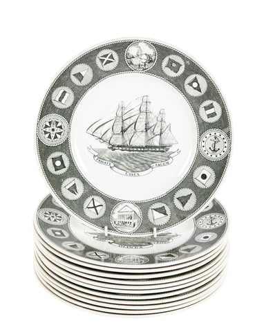 Set of 12 Wedgwood dinner plates commemorating the 150th Anniversary of the Peabody Essex Museum of Salem, MA. The ships are from pieces of art in the Peabody Essex collection, all with connections to Salem. Circa 1949.