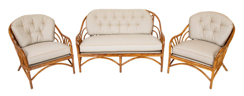 A five piece French suite of bamboo furniture comprised of a settee, pair of armchairs, a glass top coffee table and end table. New upholstery and foam. Circa 1970's.